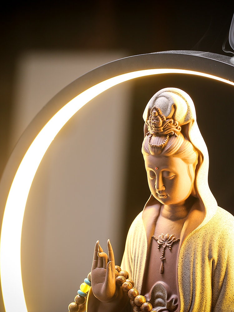 Porcelain Guan Yin Buddha Statue with an incense holder, incense burner and LED arch decoration. Ideal for home and office decoration or meditation purposes.