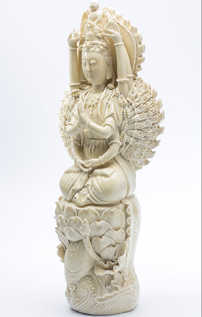 Handmade Porcelain Thousand-Arm Guan Yin Buddha Statue for the altar, home decoration or meditation. Guan Yin is synonymous with the Bodhisattva Avalokitesvara, the pinnacle of mercy, compassion, kindness and love.
